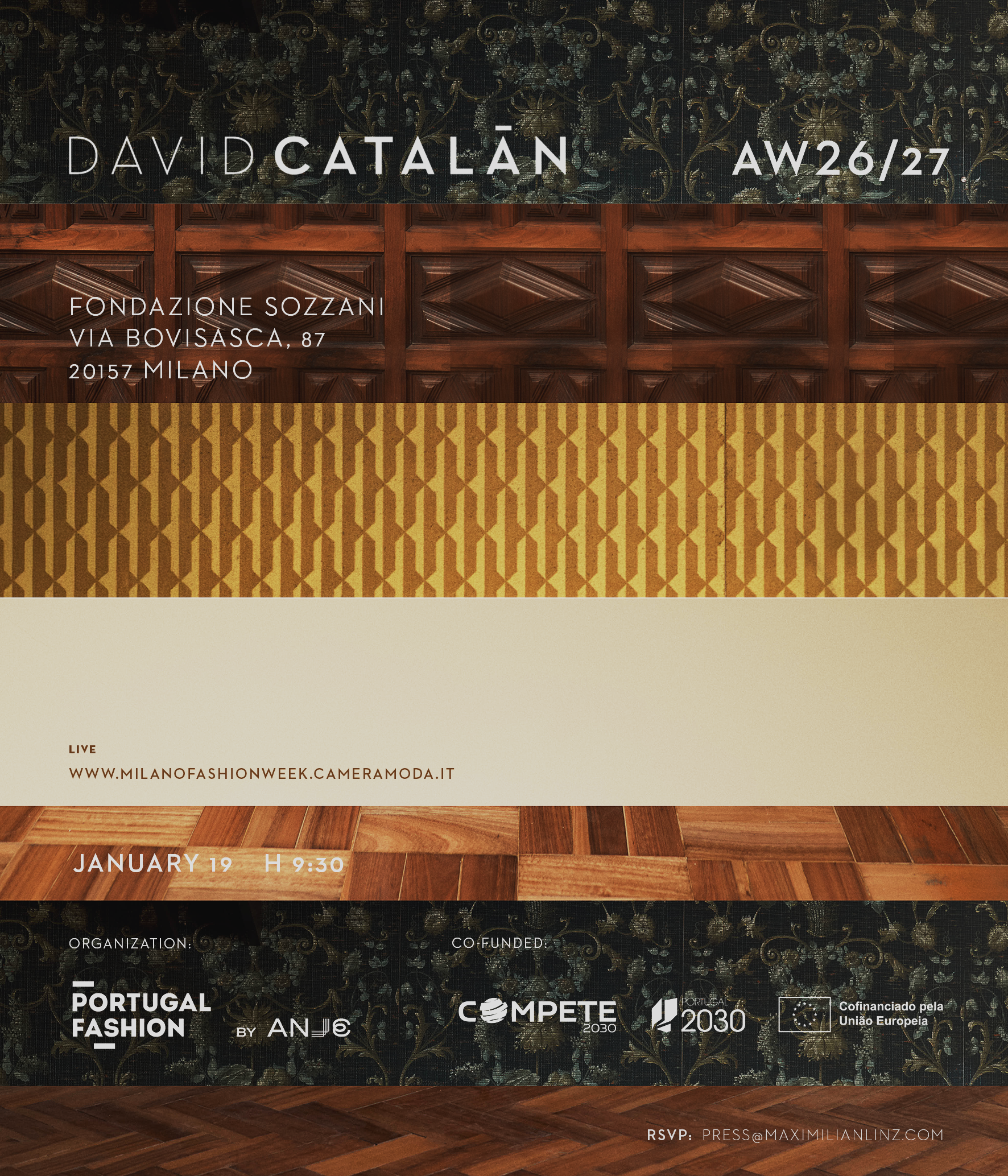 The runway show will take place at Fondazione Sozzani, Via Bovisasca 87, Milan, on January 19 at 9:30 AM (CET). The presentation will be live streamed as part of the official Milan Fashion Week Men’s digital programming. The stream will be accessible via the David Catalán website and through the official channels of Camera Nazionale della Moda Italiana, allowing buyers, press and the brand’s international audience to follow the show live.